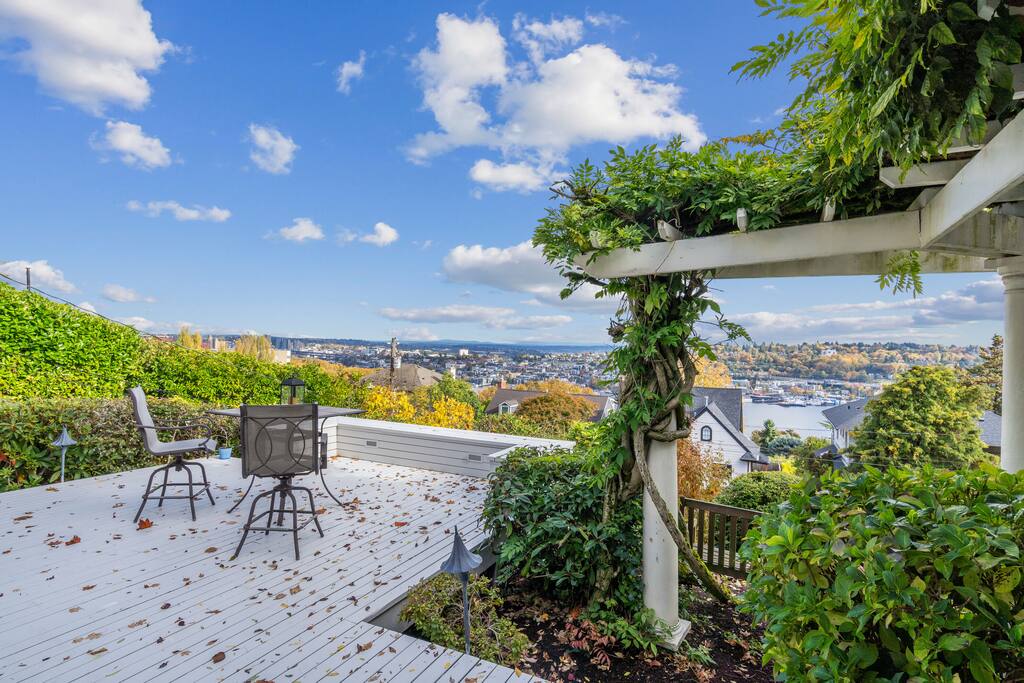 Experience true Seattle from this charming 2BR, 2.5BA Queen Anne home with stunning Lake Union and Space Needle views. Enjoy coffee on the front deck, cook in a full kitchen, and relax in a cozy living space. With fast Wi-Fi, comfy beds, and free parking, it's perfect for couples retreat or intimate getaways. Walk to cafes, parks, and iconic spots like the Space Needle. A peaceful retreat to experience Seattle like a local.