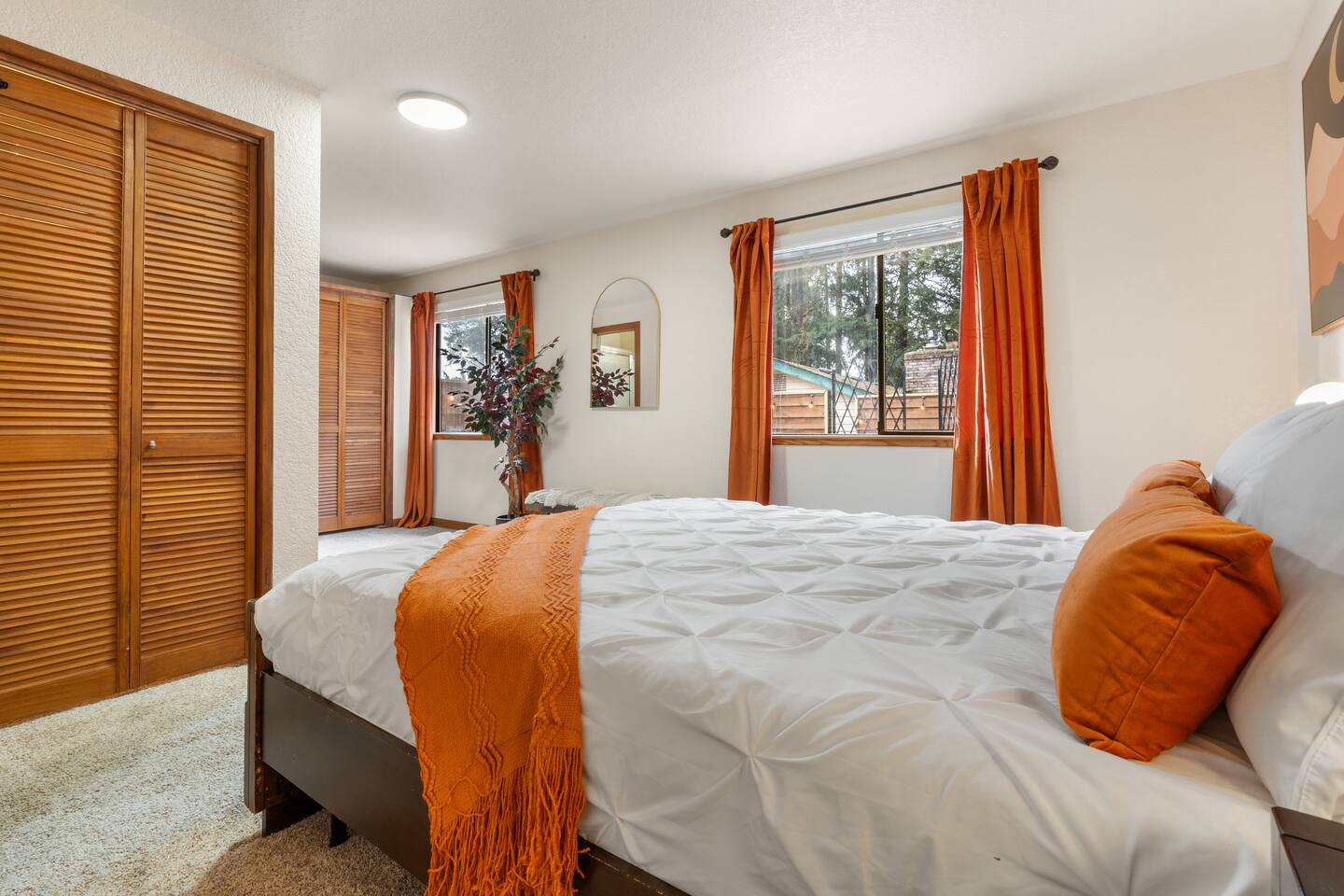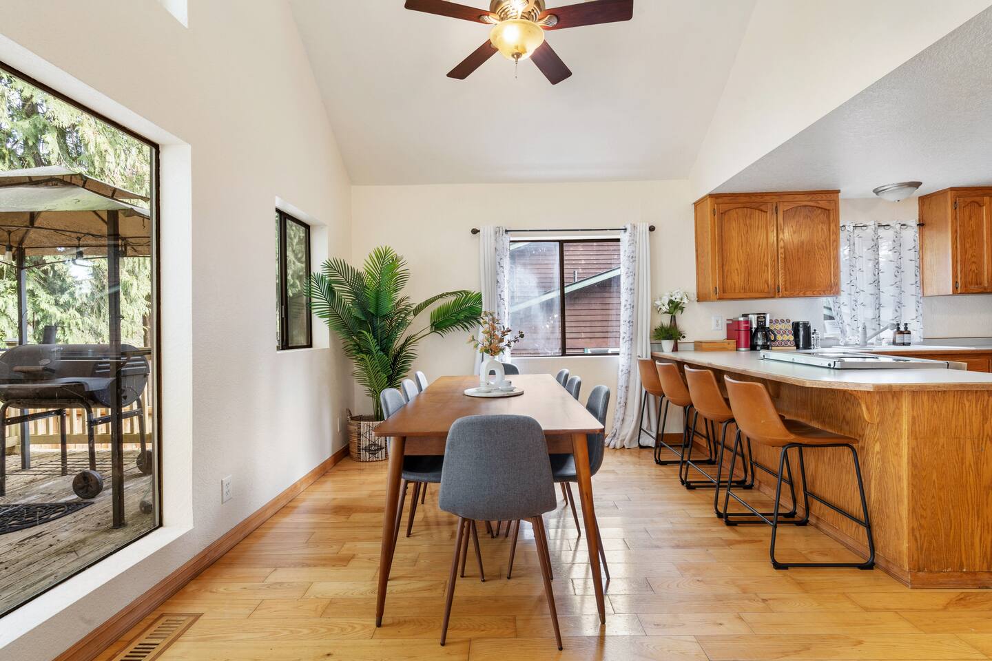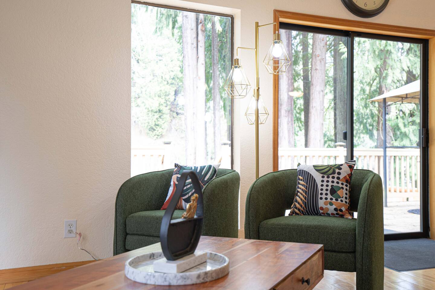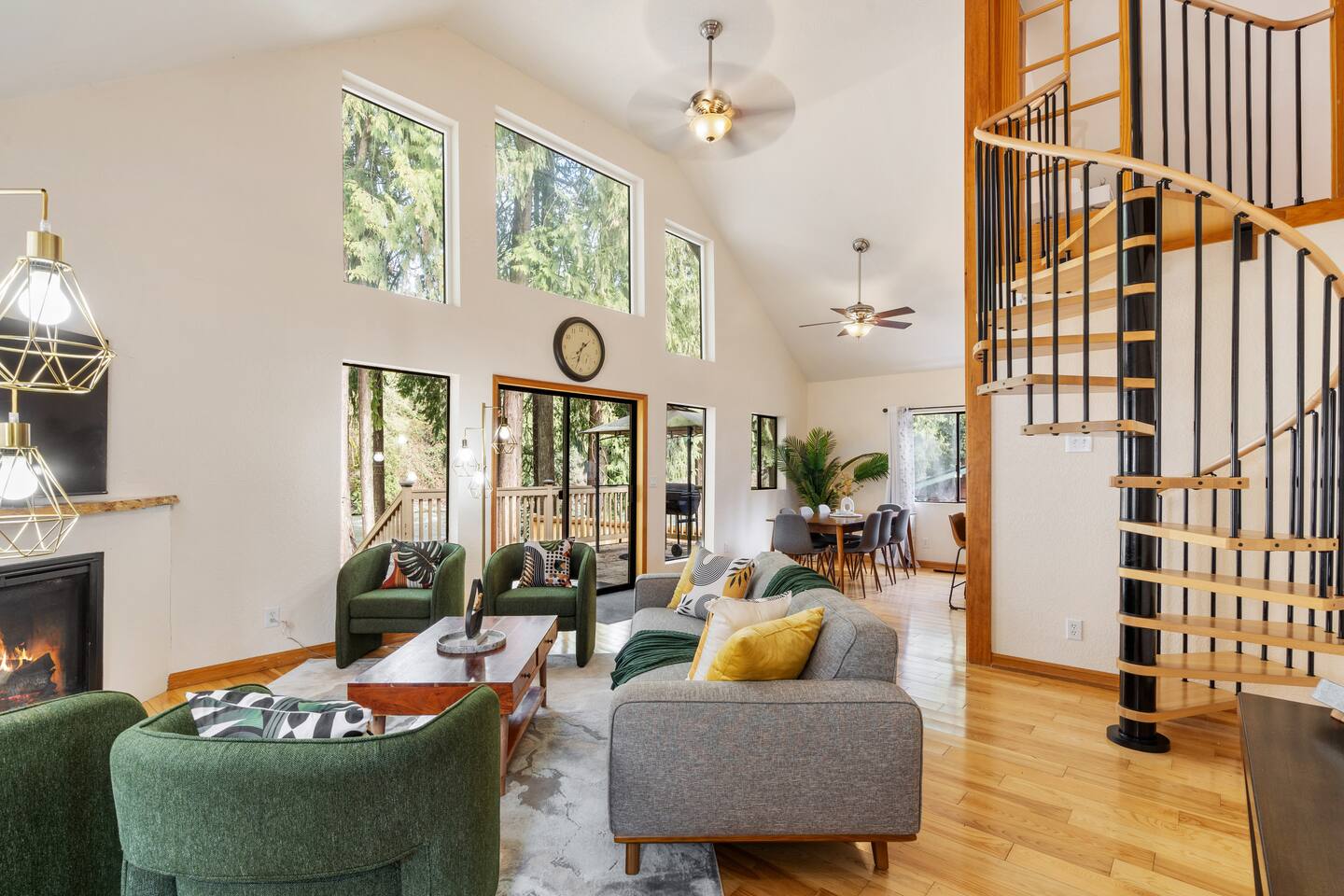 The river flows through the backyard with a cedar hot tub overlooking it. The entrance opens to the open kitchen concept tall ceiling living room with sliding doors leading to the deck and hot tub overlooking the river, all illuminated by hanging lights. This entrance has 3 bedrooms and 2 baths. The basement with its separated entrance has a karaoke setup, dancing pod area, bar, a movie theater room and a cedar sauna. This floor has one bedroom and a half bath. The kitchen is well-appointed with every essential, and there's space to dine and hang out at the breakfast bar and the window-side table. The house has 4 bedrooms and 2.5 bathrooms. There are a total of 6 queen beds. House is 5 mins from the town of Granite falls and 20 mins from the Mt. Baker-Snoqualmie National Forest. In the cascades you will find some of the best hiking and most beautiful natural features that Washington has to offer. Some prominent sites include: Gothic Basin, Big Four Ice Caves, Mt. Pilchuck Fire Lookout, Lake Twenty-Two, and Heather Lake. Other outdoor recreation activities in the area are endless as well – hiking, whitewater kayaking, river tubing, backcountry skiing, fishing, and more. Parking : There is a huge front yard and driveway for all your parking needs. You can even park multiple RV's if you want. Please do NOT try parking under the deck. Its not tall enough.