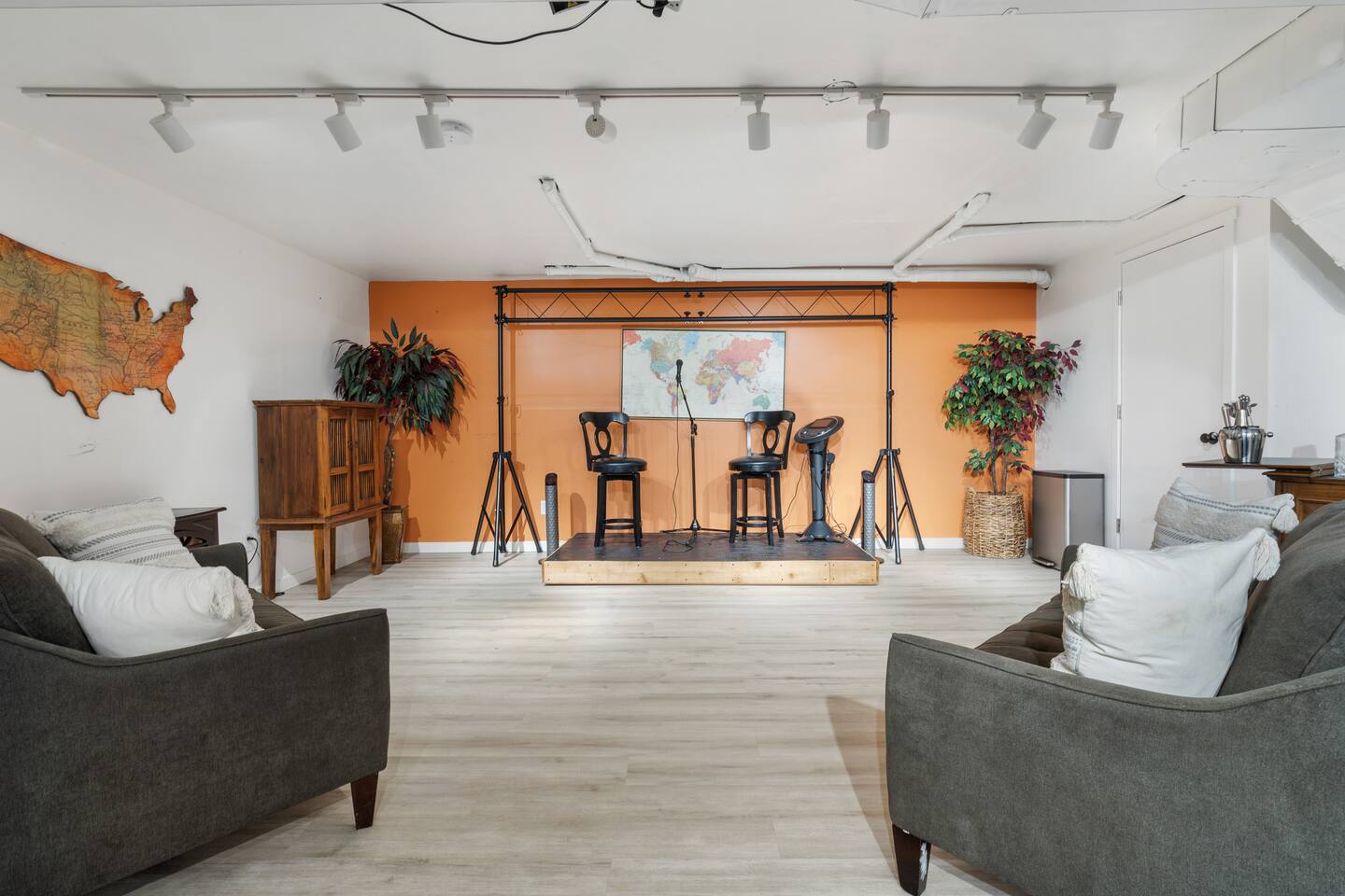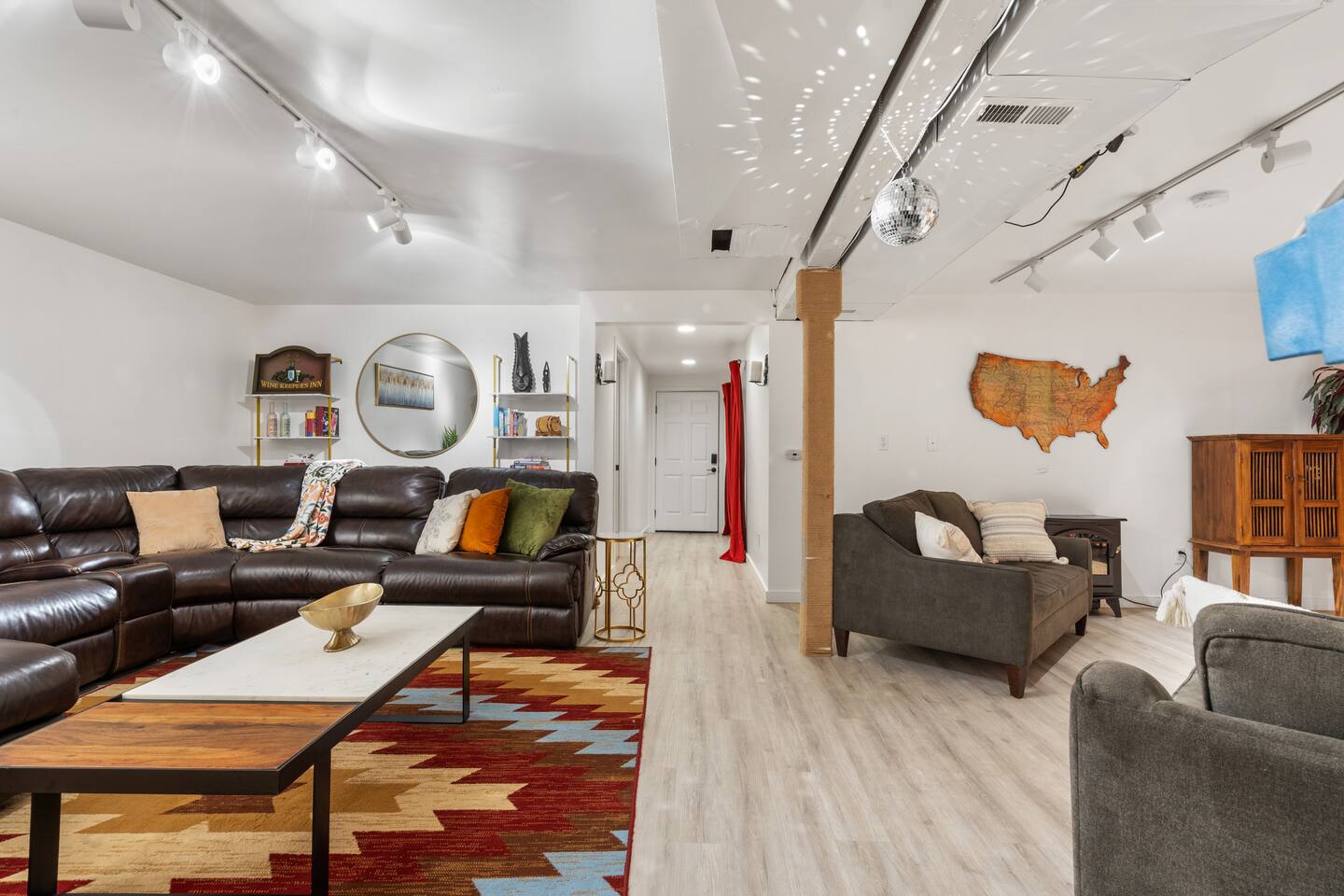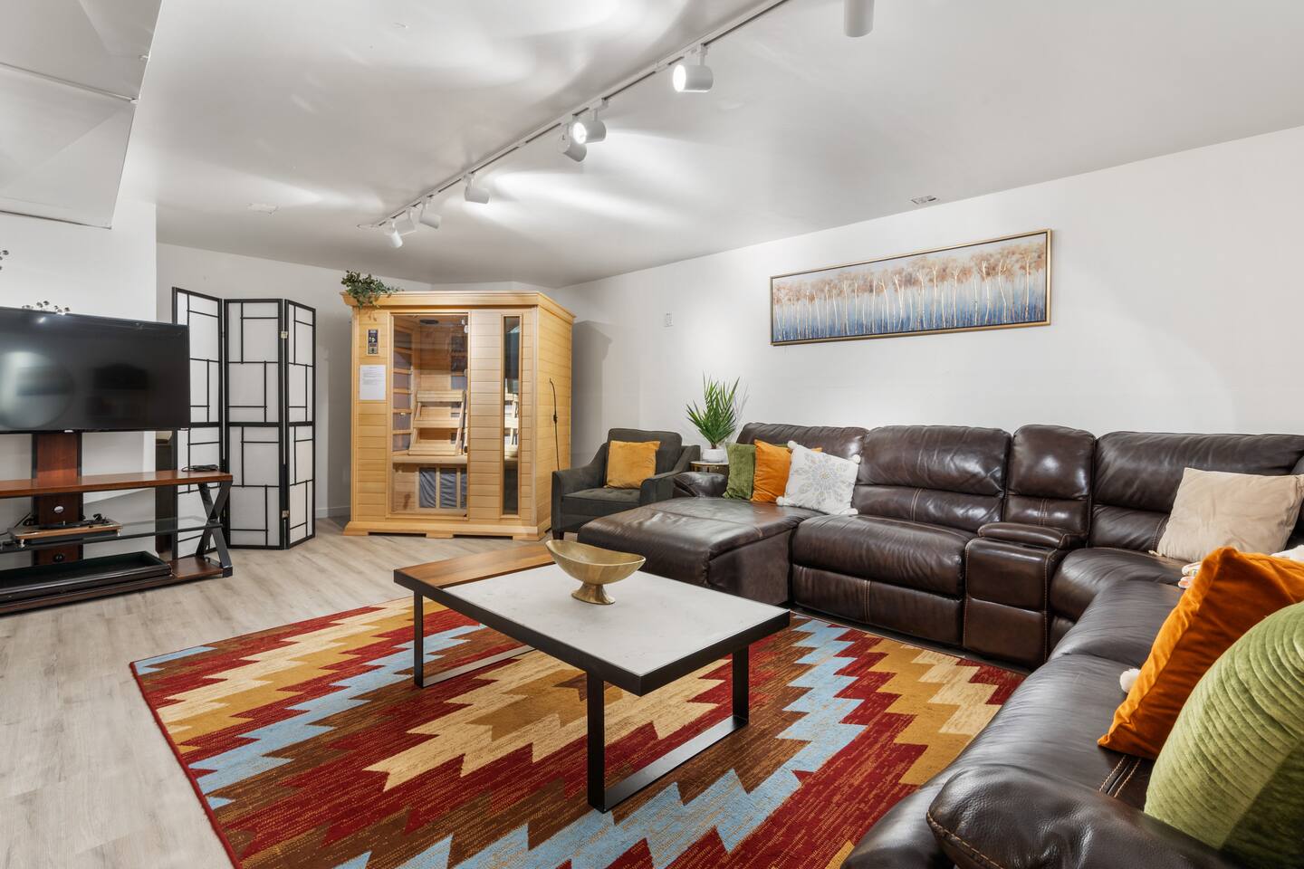 The sauna, movie theatre and one bedroom is on a different floor with a different entrance. This is in the basement. The house is an older home with all the modern amenities and furnishings. It has older cabinets and architecture. 3rd floor (one bedroom with 3 beds) is only accessible via the spiral staircase. This is a strictly NO FIREWORKS home. Any use of fireworks anywhere near the house will result in a $1000 fine.